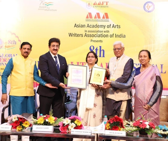 “Winning an award is always a special moment. The greatest award is the appreciation of the people. Man gives you the award but God gives you the reward. An award recognizing your talent is an honour,” said Dr Marwah while announcing the names at the Suraj Parkash Marwah Award Ceremony covering nine renowned authors/poets who were felicitated with the Suraj Parkash Marwah Sahitya Ratan Award and certificate of honour including Dr. V. L. Gaur, Sanskrit and Hindi poet, Dr. Bhuvan Lall author and film maker,  Alka Sinha poetess, Prof. Dr. Shalini Verma Author, Dr. Roopa Singh author,  Dr. Sunita author, Urvashi Agrawal ‘Urvi’ Poetess, Pawan Kumar Poet and Dr Sanjay Inamdar Poet & Novelist.